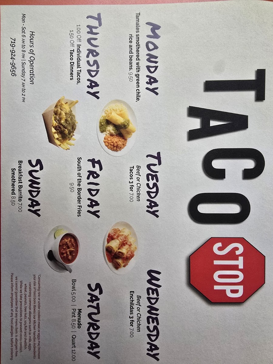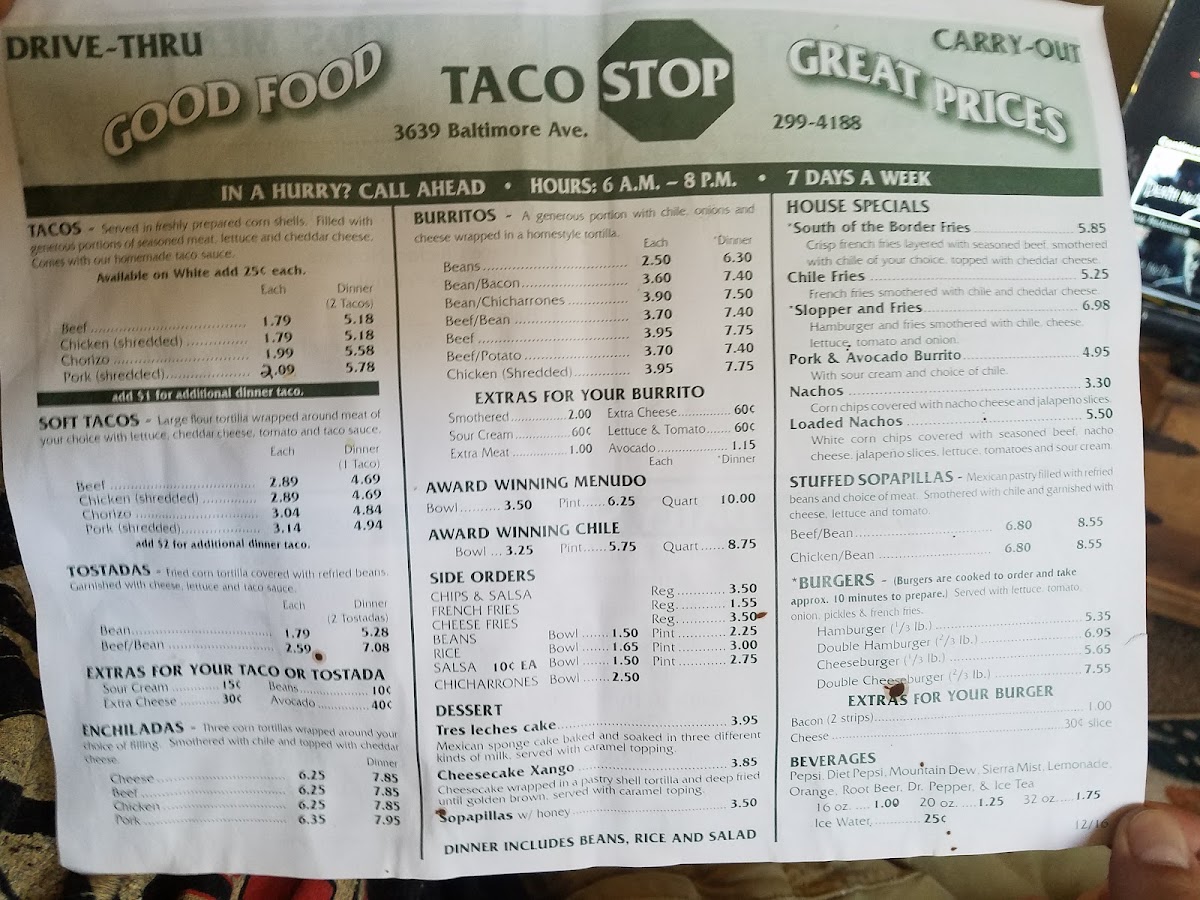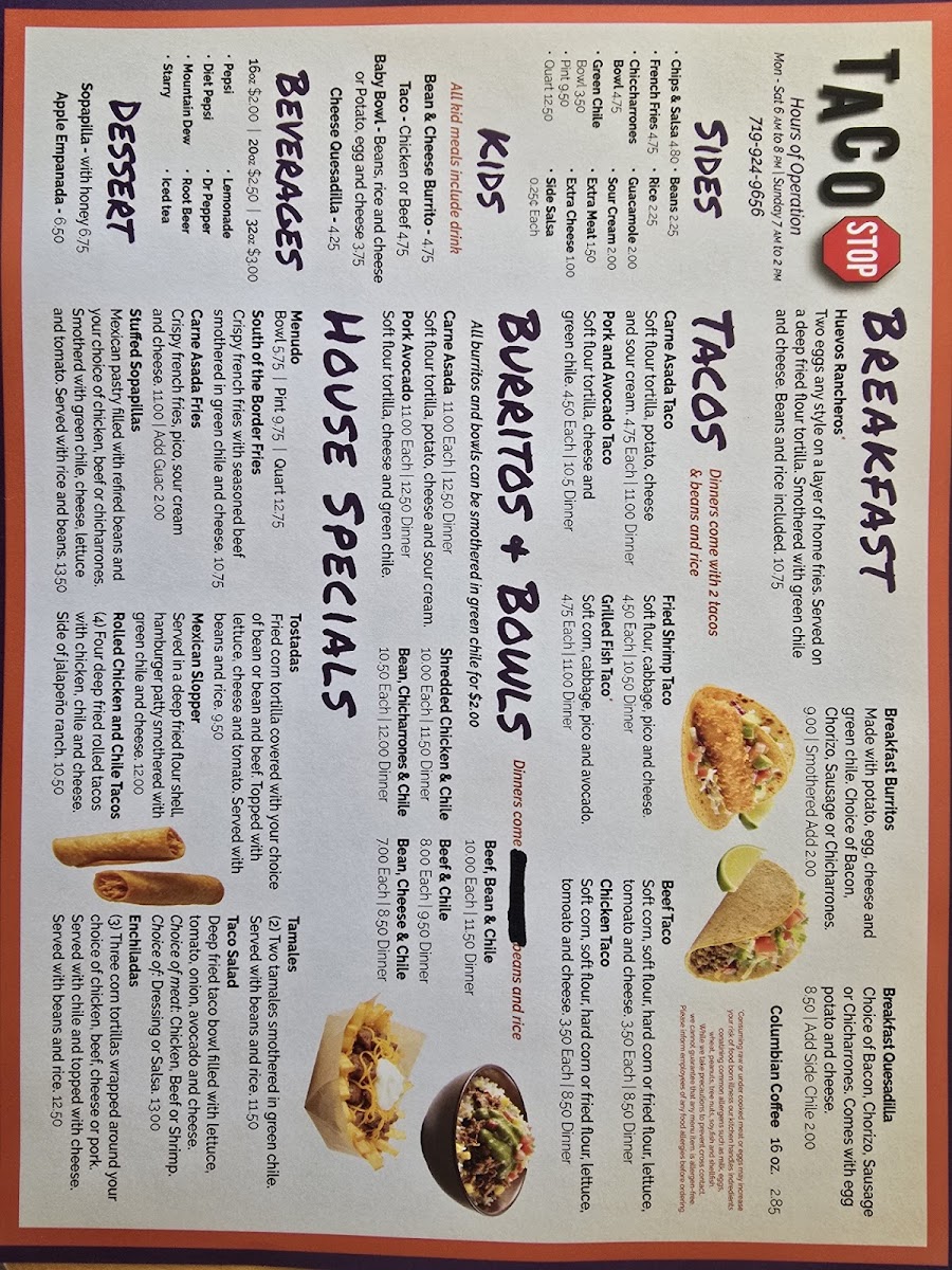 Taco Stop, located in Pueblo, Colorado, offers an authentic taste of Mexican fast food with a focused menu that shines brightest in its tacos and breakfast burritos. The taco selection spans from classic Carne Asada and Pork & Avocado to Fried Shrimp, each available in regular or hearty dinner portions. These tacos deliver fresh, balanced flavors that make a simple dish memorable. The sides complement the mains perfectly — guacamole, chips & salsa, and their distinct Green Chile in multiple sizes infuse regional charm and depth. Kids are also well catered for with options like bean & cheese burritos and quesadillas.